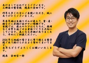 昨年も多くの方にご来院いただき、誠にありがとうございました。2026年も、地域の皆さまの健康をサポートできるよう、丁寧な施術を心がけてまいります。本年もどうぞよろしくお願いいたします。